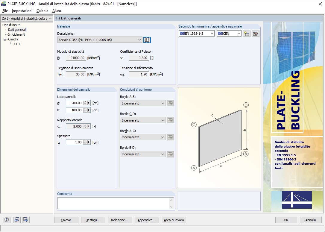 Si definiscono prima i dati del materiale, le dimensioni del pannello e le condizioni al contorno (incernierato, incastrato, non vincolato, incernierato-elastico). È possibile anche importare i dati corrispondenti direttamente da RFEM/RSTAB. Successivamente, si definiscono le tensioni ai bordi per ogni caso di carico o inserendole manualmente o importandole da RFEM/RSTAB.