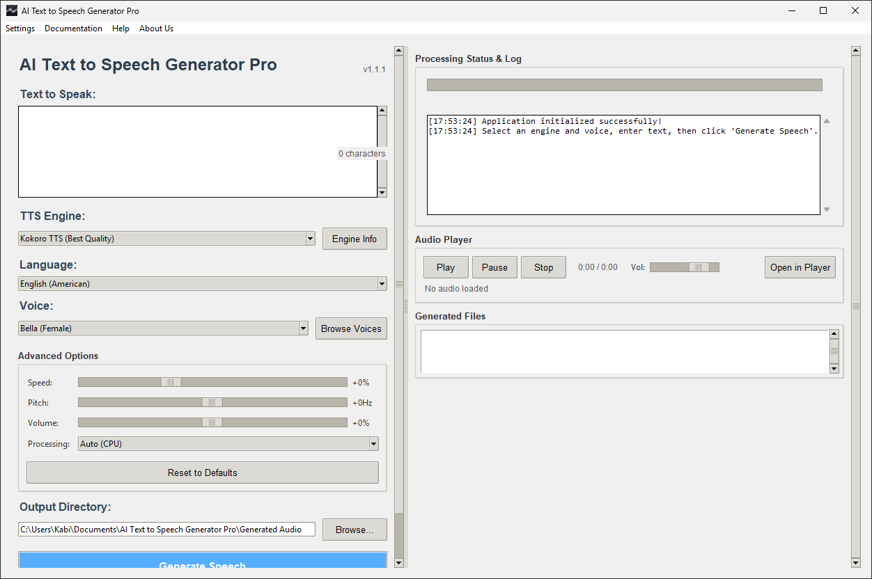 Trasforma il testo in audio ultrarealistico con AI Text To Speech Generator Pro. Grazie ai motori Kokoro, Piper e Bark, genera voci fuori campo illimitate completamente offline. Perfetto per i creatori di video, gli audiolibri e l'accessibilità.