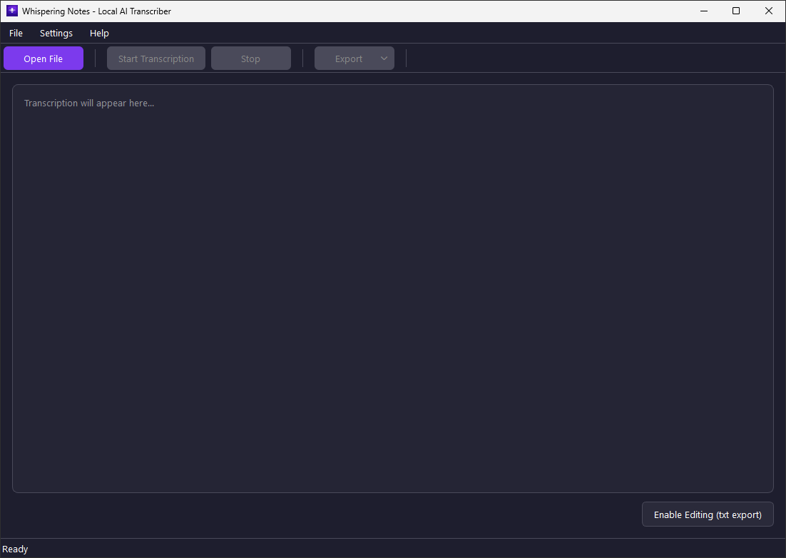 Whispering Notes AI trascrive file audio e video direttamente sul tuo PC utilizzando l'IA Whisper di OpenAI, in modo completamente offline e riservato.
